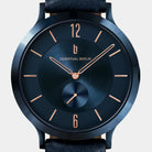 • Timeless Design: The polished case and dial are in a deep blue, with rose gold accents like the slim indices and the numerals at 12 and 6, offering a perfect blend of modern and timeless elegance.